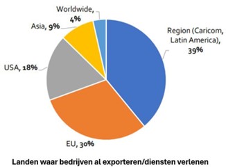 Uit het onderzoek blijkt dat 39% van de exporteurs hun product verkoopt aan landen in het Caribisch gebied en Latijns-Amerika, terwijl de Europese Unie (30%) en de Verenigde Staten (18%) ook belangrijke markten blijven.