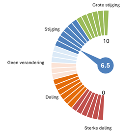 De meeste exporterende bedrijven hebben positieve verwachtingen voor de toekomst: 65% van ondervraagde bedrijven verwacht een stijging in hun exporten en buitenlandse inkomsten in de komende 12 maanden. Maar 16% verwacht een daling. Als we hun verwachtingen in een barometer willen uitdrukken (zie figuur), dan is het gemiddelde cijfer dat exporterende bedrijven hebben gegeven, een 6.5 (op een schaal van 0 tot 10) wanneer wordt gevraagd of ze verwachten dat hun exporten zullen stijgen of dalen in de komende 12 maanden. Dit staat in contrast met de meest recente exportcijfers van 2023, die lieten zien dat de Surinaamse niet-extractieve export juist met één procent was gedaald. Deze exportgroei voor niet- extractieve producten kan bijdragen aan de diversificatie van de Surinaamse handel.