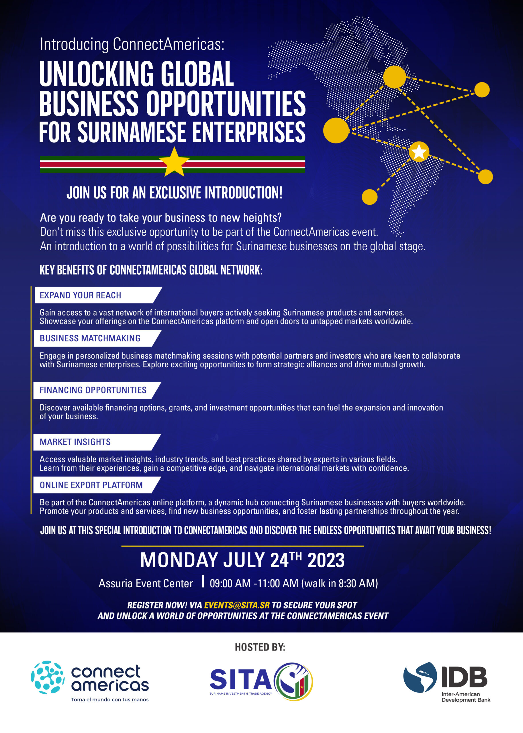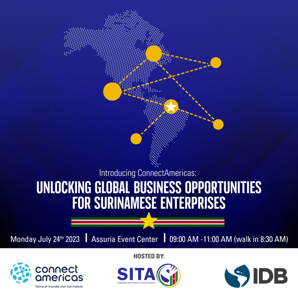 Exciting news for Surinamese businesses! Join us at the ConnectAmericas event in Suriname, organized by SITA, where we’ll unlock opportunities for Surinamese businesses. Expand your reach, access financing, engage in business matchmaking, gain knowledge from industry experts, and join a global export platform. Don’t miss out! Register now